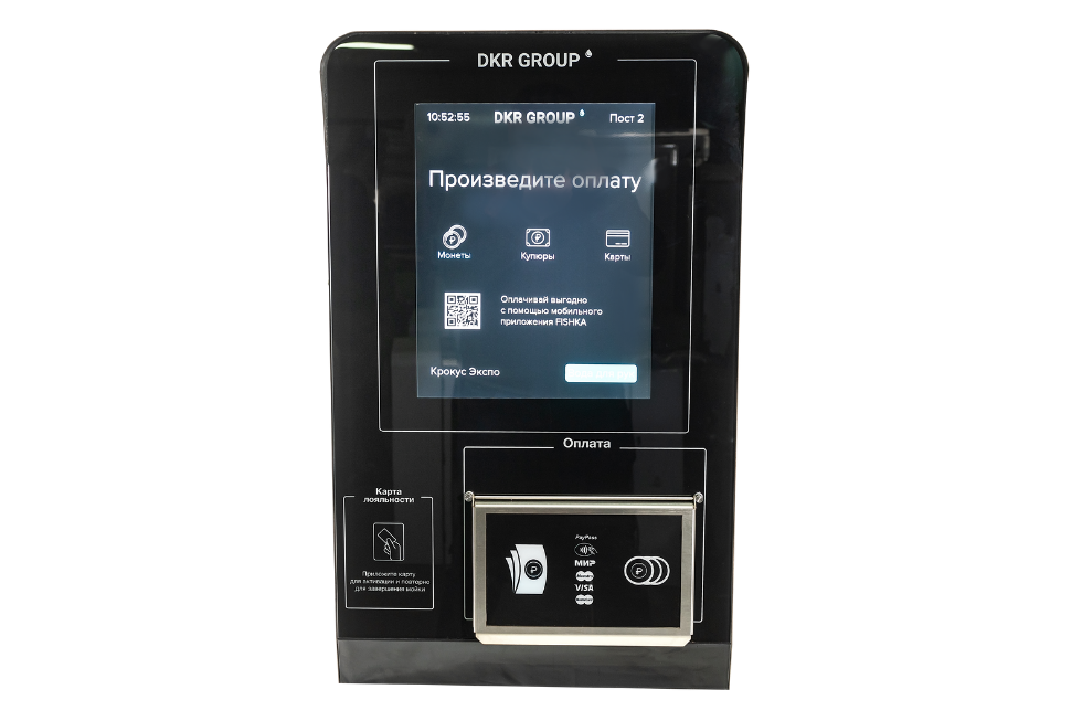"Панель управления моечным комплексом выполнена из шлифованной нержавеющей стали с сенсорным экраном 19 дюймов, с вставкой из каленого стекла по центру. Кол-во функций на терминале до 16. Поддерживает оплату банковской картой, купюрами , монетами, картами лояльности. Возможно брендирование по эскизу заказчика. Взаимодействия клиента происходит за счет сенсороного экрана."