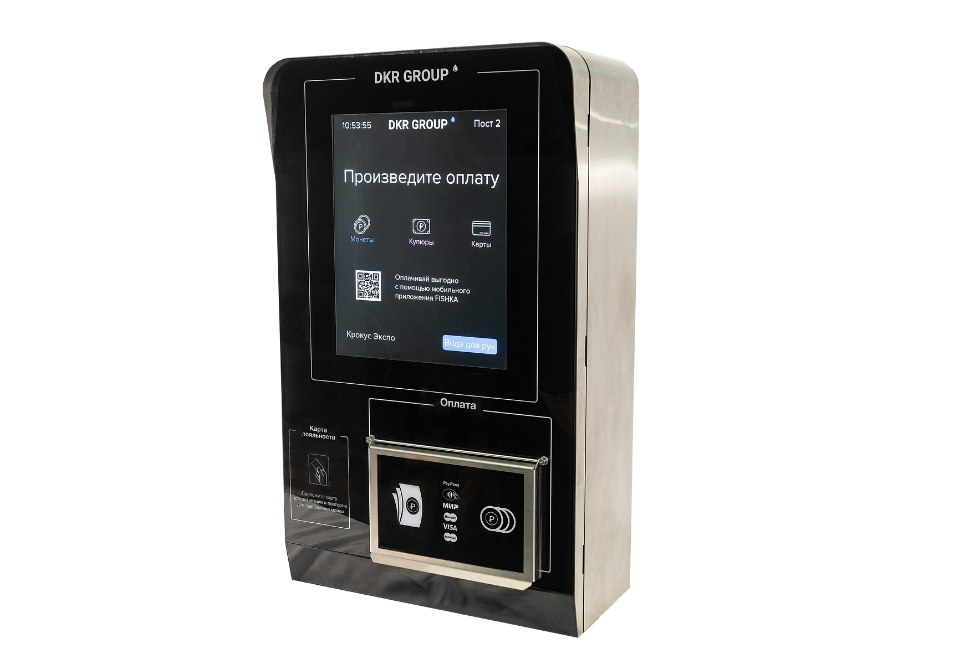 Поддерживает оплату банковской картой, купюрами , монетами, картами лояльности. Возможно брендирование по эскизу заказчика. Взаимодействия клиента происходит за счет сенсороного экрана."